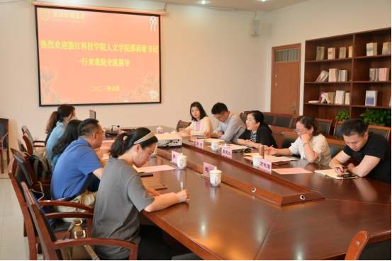 6月7日湖州师范学院人文学院考察调研会上,湖州师范学院人文学院党政班子主要领导及实验员、辅导员代表参加交流,介绍了“红色典藏”党建品牌培育、专业认证、师范院校学生就业特点等方面的情况,双方围绕地方院校党建四个融合、支部品牌培育和建设、中文学科竞赛和科技竞赛、师范院校和非师范院校中文系学生就业优劣势等方面交流经验,取长补短。会后,调研团一行实地考察了学院新媒体实验室、师范生研习室等场地。在湖州学院人文学院调研会上,湖州学院人文学院党委班子参加座谈,介绍了学院党建融入教育教学事业和地方经济发展、学院湖州“宋词之州”文化品牌建设、人才引育、学生安全等方面的举措,双方围绕这些方面开展深入交流,就新时代汉语应用型人才培养,实现学科的文化价值与现实价值并行是汉语言专业可持续发展的方向等方面达成共识。