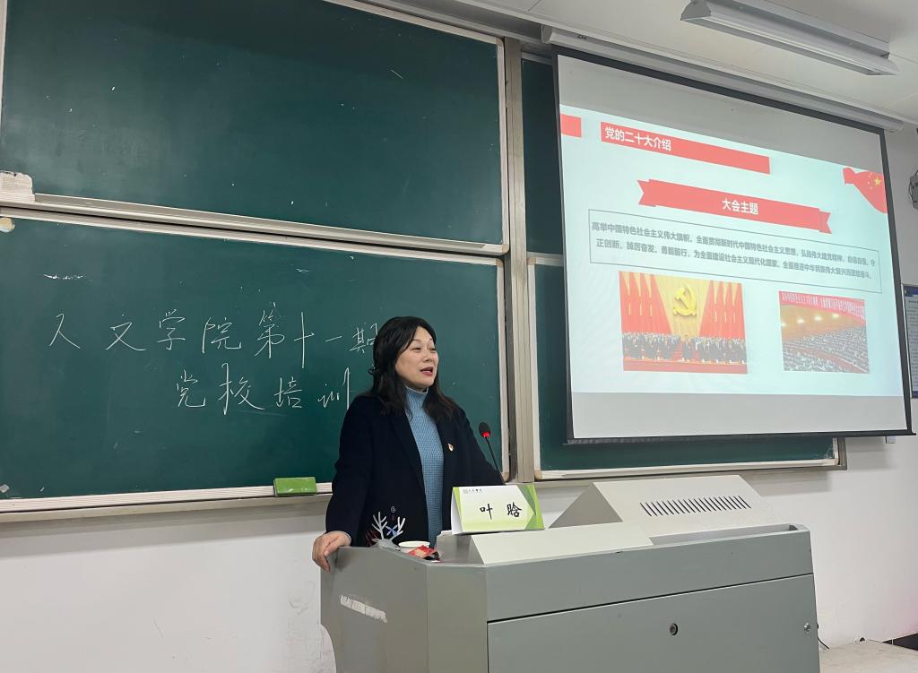 11月16日晚,人文学院第十一期入党积极分子培训班在教学楼A1-102开课,本次党课主题为“学习中国共产党的二十大报告原文”,由人文学院院长叶晗主讲。