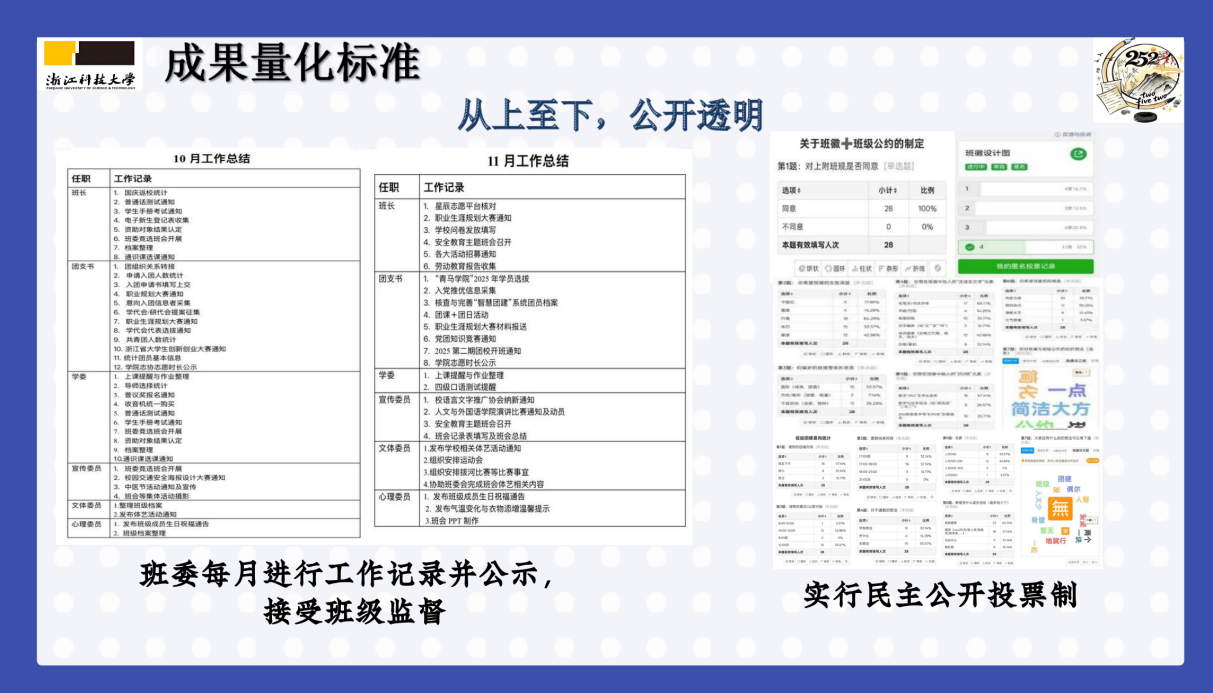 通过最美班级“六个一”班级建设工作,各班级持续完善班级建设体系,不断为学生成长提供更丰沃土壤与更广阔的表现舞台。期待未来有更多班级能够不断前行,让奋斗与光亮在浙科大的校园中持续生长、熠熠生辉。