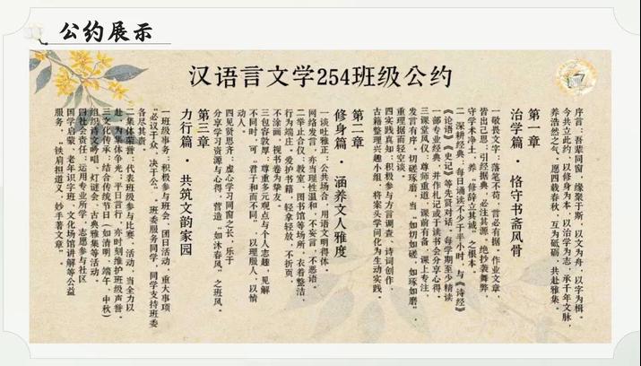 汉语言文学254班以“全员参与、贴合专业”为原则,完成个性化班级公约制定与全员签署。公约融入学术诚信、网络安全等专业伦理条款,分三章12条细则。配套制作电子版白话文版本,举行签署仪式,建立执行台账,知晓率100%。通过书法书写、校园朗诵、原创视频等创意活动传播公约精神,让“文以载道,约以立身”理念落地生根,凝聚班级力量。