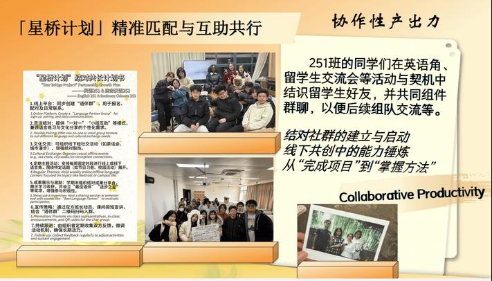 英语251班以 “LinguaScape: 言筑星群结对同行计划” 为抓手,以群星为喻构筑中外学生跨文化学习共同体,融合专业指导、学业帮扶、朋辈指导、校企结对多方联动模式结出丰硕实践成果。通过 “星桥计划” 精准匹配中外伙伴,开展英语角、文化参访等活动,同步发起 “语筑新园” 文明倡导行动,在实践中培养协作产出、跨文化传播与公共叙事能力。项目持续推动帮扶模式制度化、平台化、故事化,让中外学子在跨文化协作中彼此照耀、共同成长,以语言为桥,书写结伴同行的成长篇章。