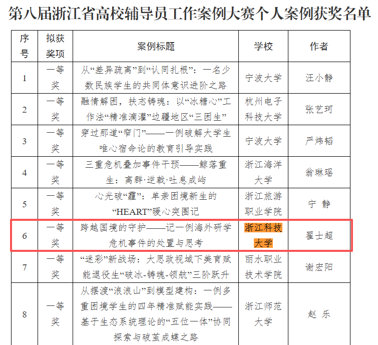近日,第八届浙江省高校辅导员工作案例大赛获奖结果正式公布。我院辅导员翟士超老师撰写的学生工作处置与反思案例,在全省441篇参赛作品中脱颖而出,荣获个人案例一等奖。