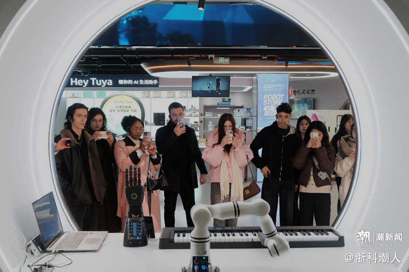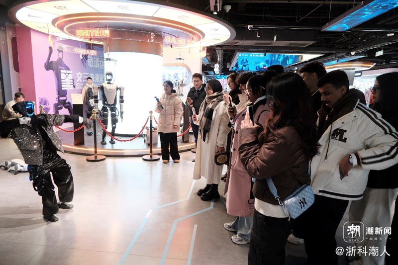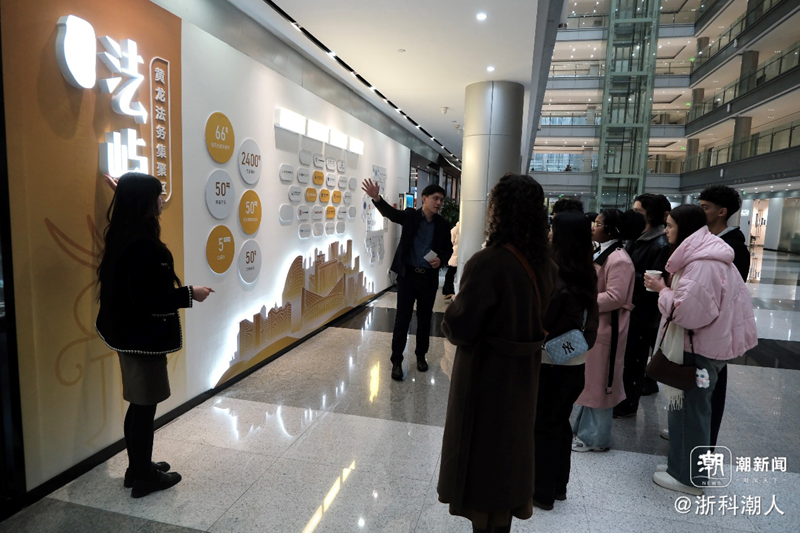 活动首站设在西湖区AI法韵街区——0101park。在这里,留学生们在工作人员的引导下,依次参观并体验了AI普法互动场景、未来科技体验中心等特色区域,亲身感受杭州将法治宣传与前沿科技深度融合的创新成果。智能化、场景化的普法形式,让法律知识变得生动可感,令在场学生频频驻足、积极参与。
