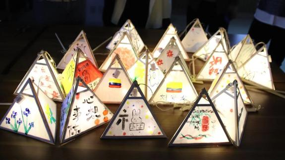 宫灯又称宫廷花灯,是中国彩灯中最富特色的汉族传统手工艺品之一,是中国传统文化的一个符号。材料分发完毕后,同学们迫不及待动手制作。完成宫灯需要图案彩绘、框架粘合、彩灯安装等步骤,同学们互帮互助,中国同学向外国同学介绍宫灯来历,讲解如何制作,大家做成的宫灯各不相同,有的绘上了国旗,有的是可爱卡通画,还有一些绘着中国画以及代表美好祝愿的汉字。