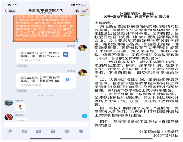 为阻断新型冠状病毒感染的肺炎疫情向校园蔓延,确保师生生命安全和身体健康,在校疫情防控办的领导下,外国语学院/中德学院迅速成立了疫情防控工作领导小组,并于2月3日发出《外国语学院/中德学院关于“离校不离教,停课不停学”的倡议书》,倡议全体教师做好自身防护,减少不必要的出行,不提前返校,密切保持与学校的联系,要求各系部和基层教学组织加紧做好开学有关教学预案,组织教师精心备课,加强在线教学技术培训,确保实现疫情防控与教育教学两不误。