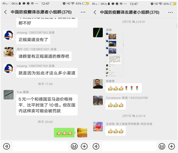 外国语学院/中德学院充分发挥语言优势,积极参与疫情防控工作,服务社会。当前很多海外华人华侨及国际友人在世界各地积极寻找和采购医疗物资,其中不乏遇到种种语言翻译的难题。2月2日,浙江省慈善联合总会发起针对本次疫情的翻译志愿服务的倡议。目前,已有来自世界各地超千名志愿者加入,成员有大学师生,以及语言翻译机构的工作人员、语言培训的教师,提供包括英语、德语、法语等31种语言翻译服务。同时,积极发挥翻译志愿者的语言优势,主动收集和编译各国相关医疗用品的出口信息,方便全球采购。德语教师黄扬老师于2月2日加入翻译志愿者小组,积极关注德语翻译信息和与德国相关的物质采购信息,提供德语翻译服务。