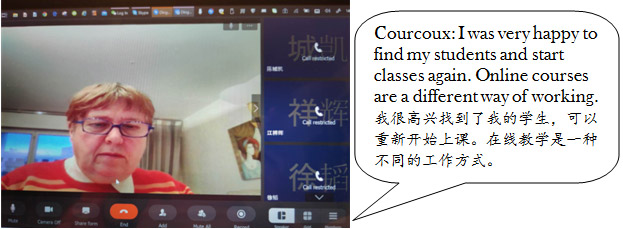 Nadine Courcoux是来自法国的外教,今年是Courcoux在我院任教的第3年。寒假期间,她在马来西亚旅游时不幸被偷走了护照等资料,只好滞留在当地申办新护照。为此,Courcoux不得不改变计划,于2月中旬直接从马来西亚回到法国。由于Courcoux把法国住宅的钥匙放在学校听松公寓,她只能寄宿在朋友家里。Courcoux在知晓学校开展在线教学的消息后,主动提出要与学院同步,开展网络教学。由于法国与中国有7个小时的时差,而且Courcoux每周有两次要在上午上课,这个时候正好是法国的半夜。法语教研室考虑到其年纪较大,还有时差的问题,提出可以让其他老师代课或者推迟上课。Courcoux婉拒了这个提议,还是坚决地承担了所有的教学工作。在教研室同事多次远程指导下,她学会了使用钉钉群上课。她说:“很高兴能为学生上课,网课跟传统的上课方式很不一样,目前正在适应中,进展也比较顺利”。