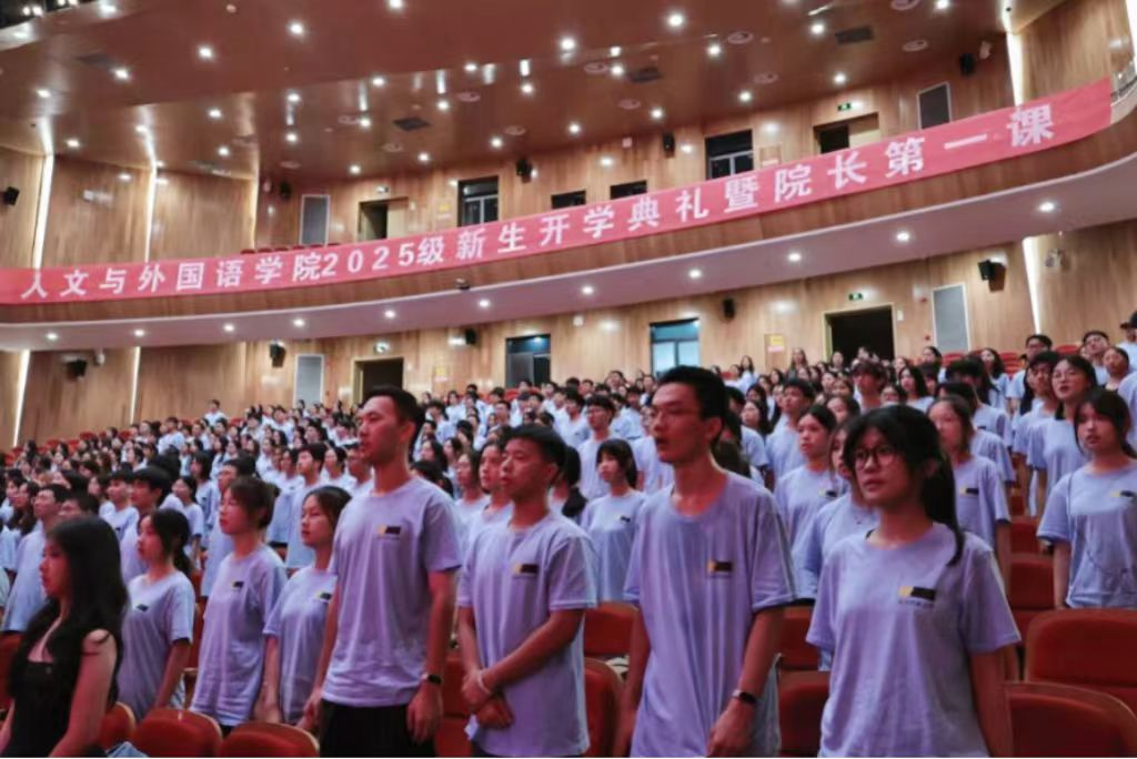 2025级全体新生跟随领誓人一起宣誓,《为国读书 复兴有我》,铿锵誓言回响在水晶剧院中,展现出人文外语学子作为时代青年的坚定担当与责任心。