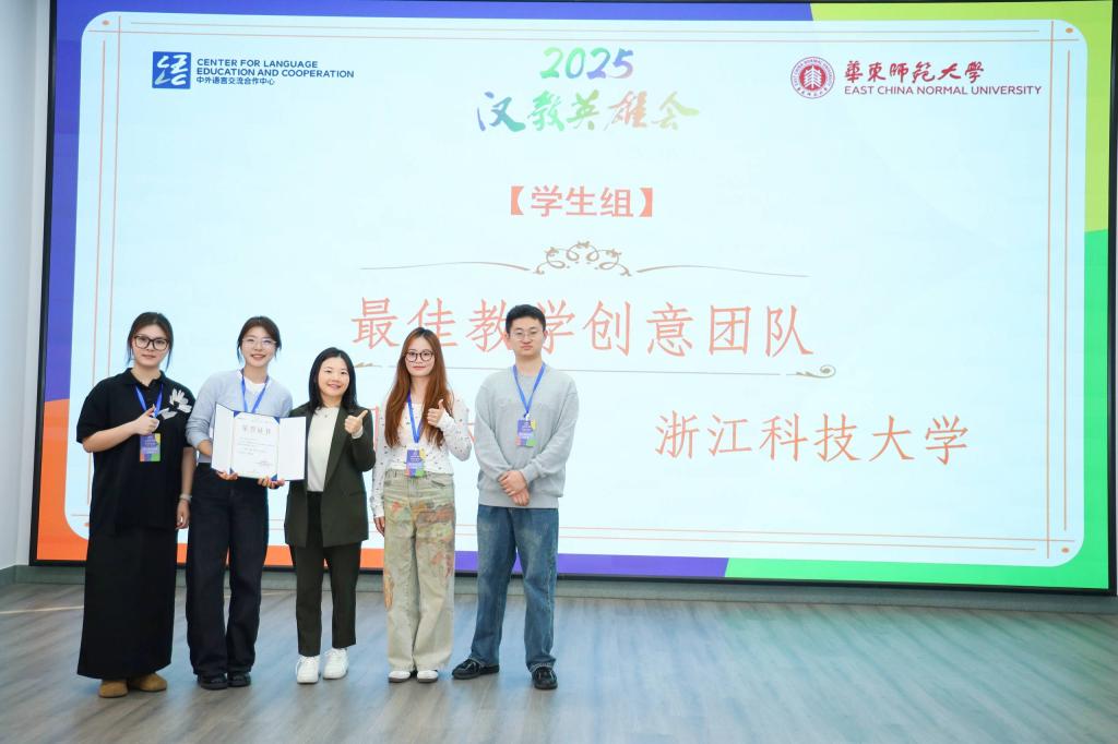 据悉,2025“汉教英雄会”由教育部中外语言交流合作中心、全国国际中文教育专业学位研究生教育指导委员会、全国高校汉语国际教育本科专业负责人联席会联合主办,我校团队从来自30所高校的38支队伍中脱颖而出,获邀参加在华东师范大学普陀校区举办的线下交流展示。在交流活动现场,我校团队与来自华东各省市的17支学生队伍同台展示,团队项目凭借设计理念超前,结合浙江“电商文化”的地域特色,深度融合真实语境与任务型教学获得一致好评。